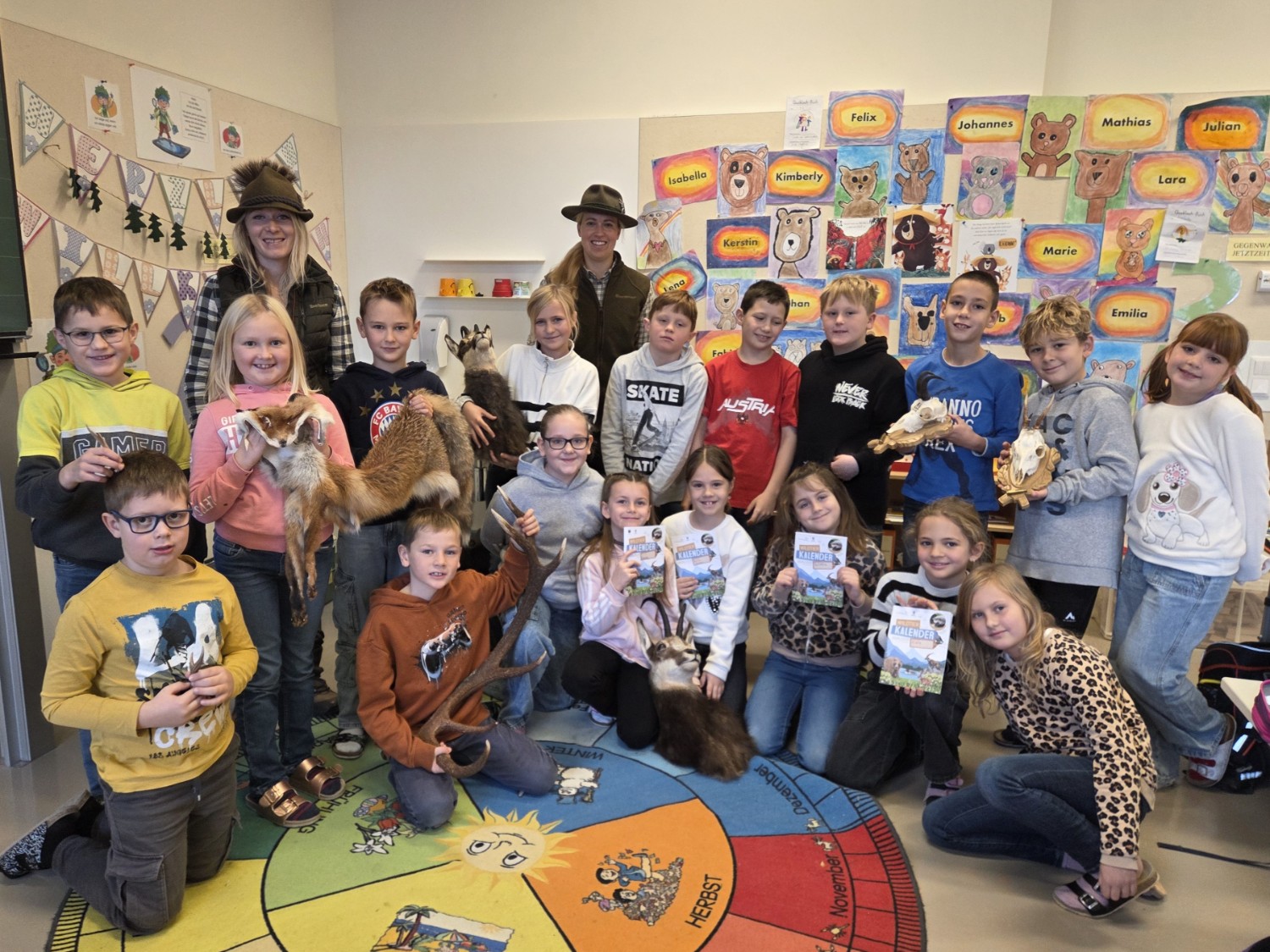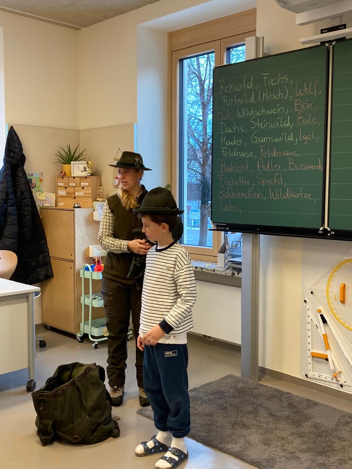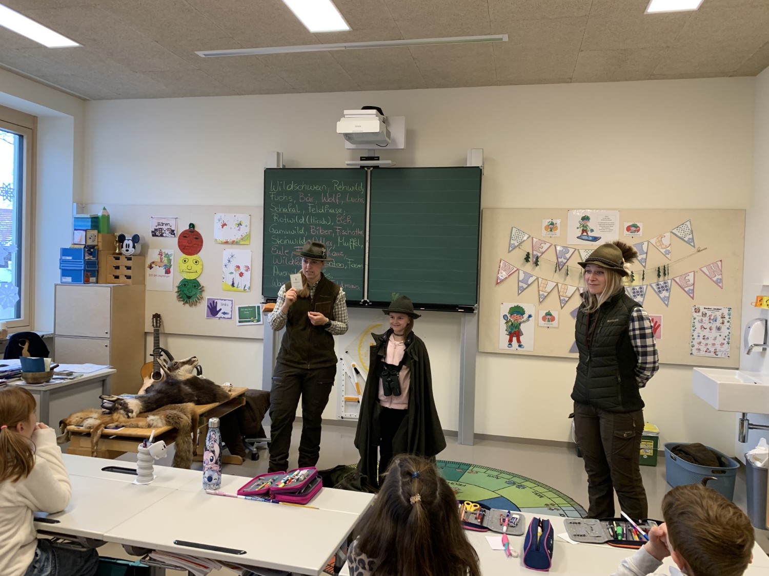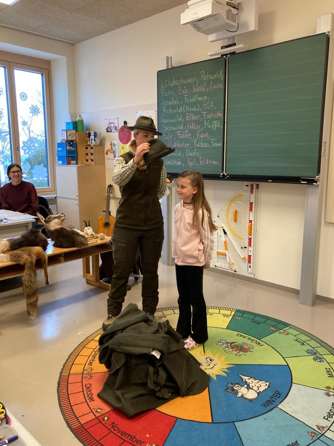 Zu Beginn wurde gemeinsam erarbeitet, welche Wildtiere den Schülerinnen und Schülern bekannt sind. Anschließend erklärten die Jägerinnen die vielfältigen und unverzichtbaren Aufgaben der Jagd. Pro Klasse durfte ein Kind in die typische Ausrüstung eines Jägers schlüpfen – mit Jägerhut, Wetterfleck, Fernglas und weiteren Utensilien.