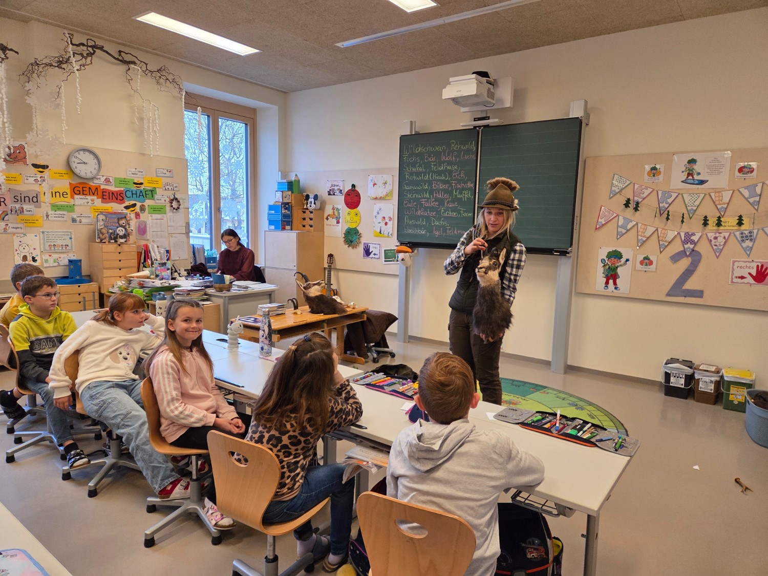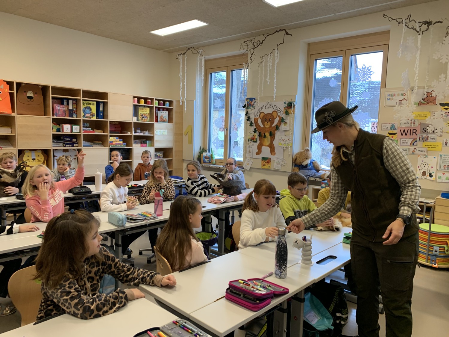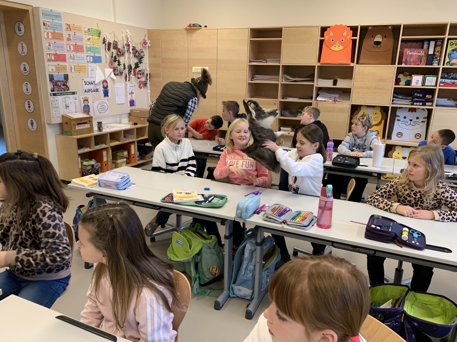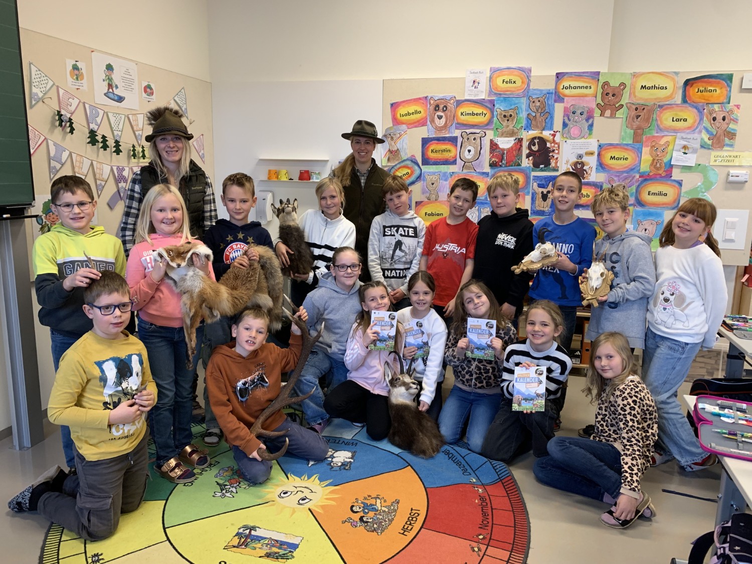 Zu Beginn wurde gemeinsam erarbeitet, welche Wildtiere den Schülerinnen und Schülern bekannt sind. Anschließend erklärten die Jägerinnen die vielfältigen und unverzichtbaren Aufgaben der Jagd. Pro Klasse durfte ein Kind in die typische Ausrüstung eines Jägers schlüpfen – mit Jägerhut, Wetterfleck, Fernglas und weiteren Utensilien.
