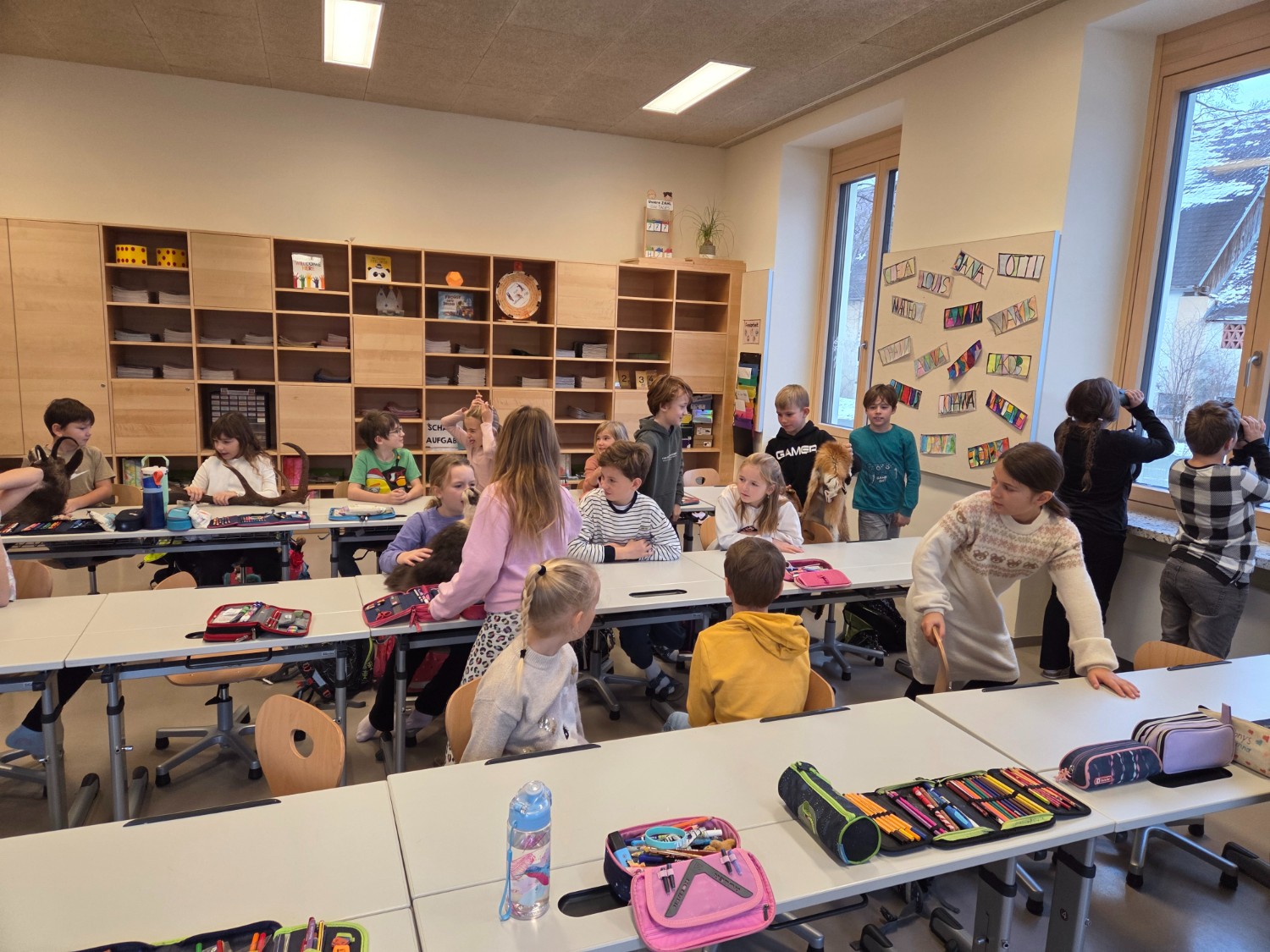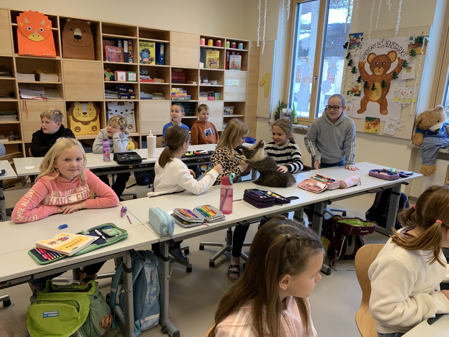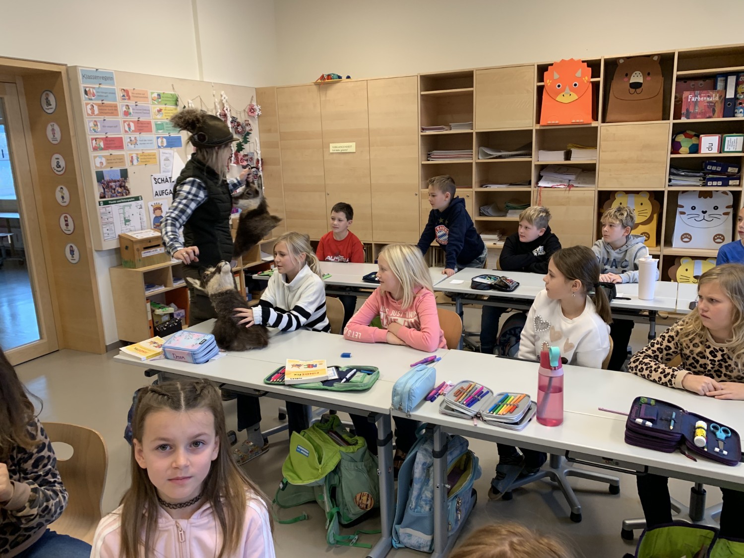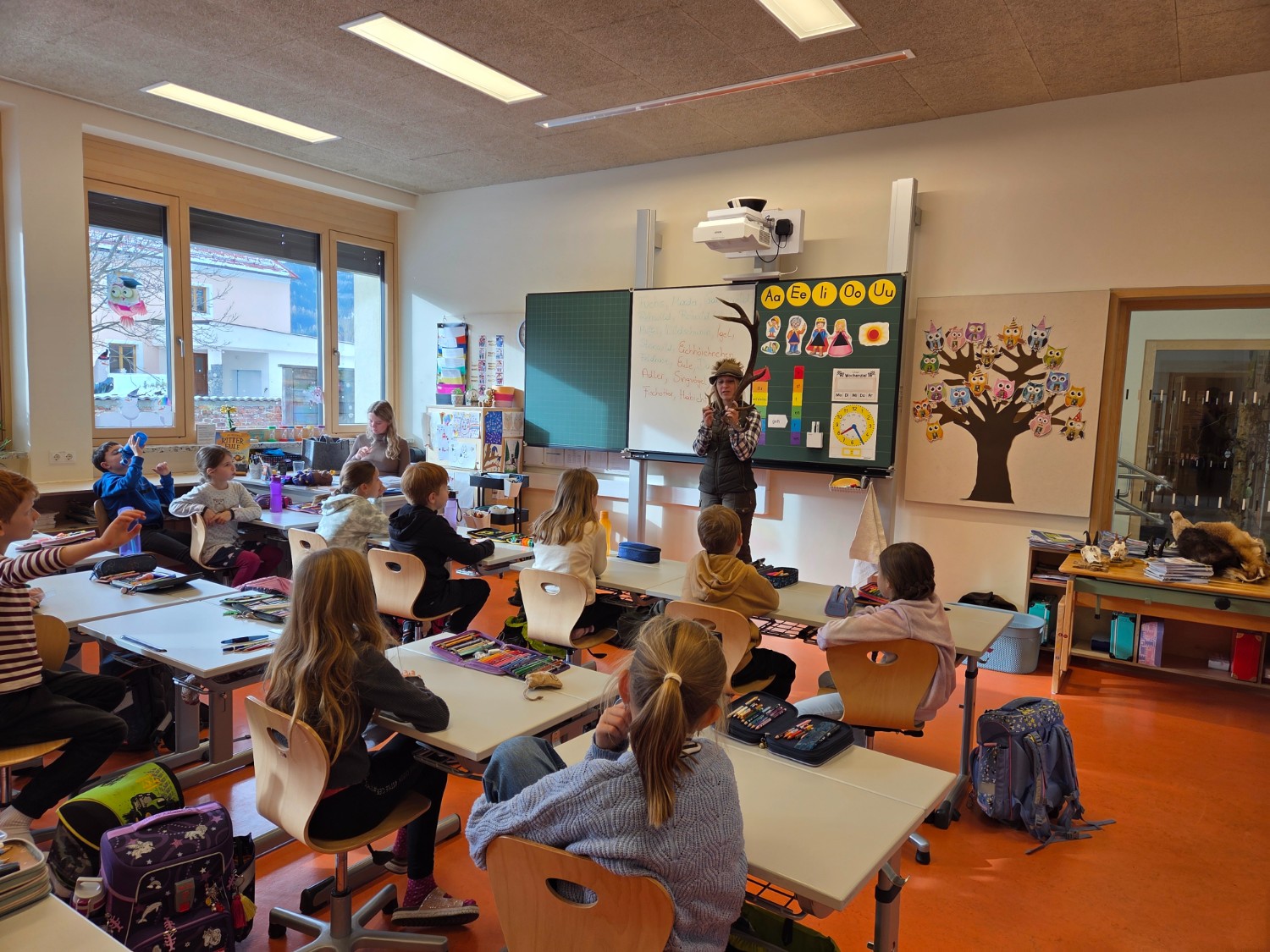 Zu Beginn wurde gemeinsam erarbeitet, welche Wildtiere den Schülerinnen und Schülern bekannt sind. Anschließend erklärten die Jägerinnen die vielfältigen und unverzichtbaren Aufgaben der Jagd. Pro Klasse durfte ein Kind in die typische Ausrüstung eines Jägers schlüpfen – mit Jägerhut, Wetterfleck, Fernglas und weiteren Utensilien.