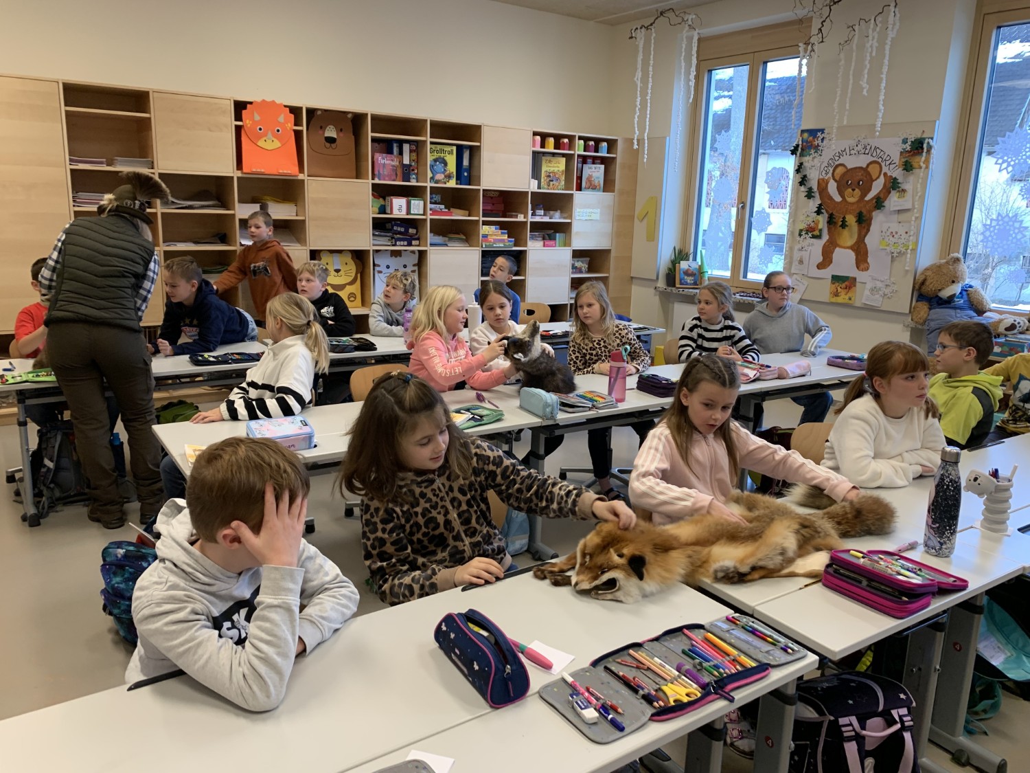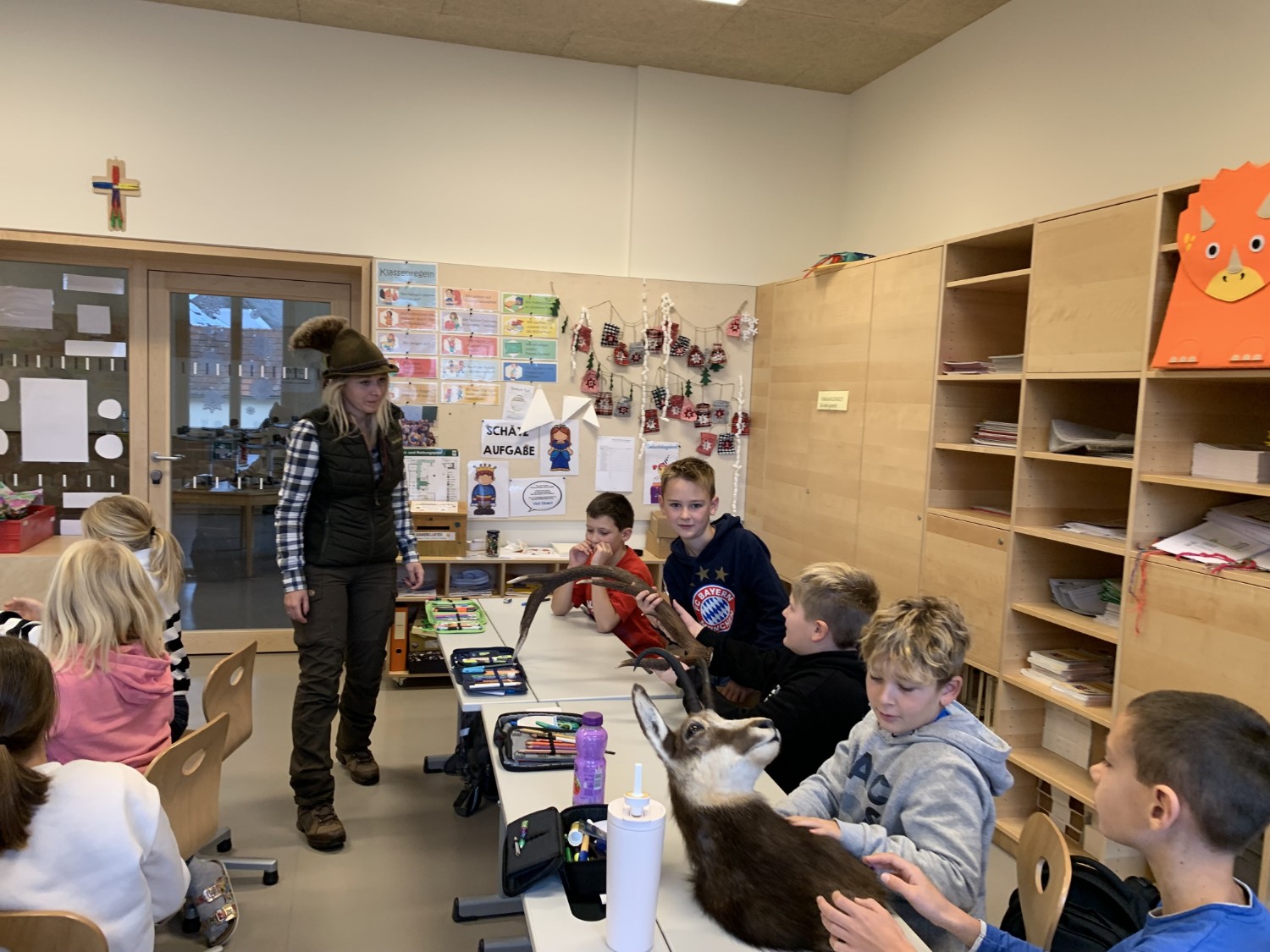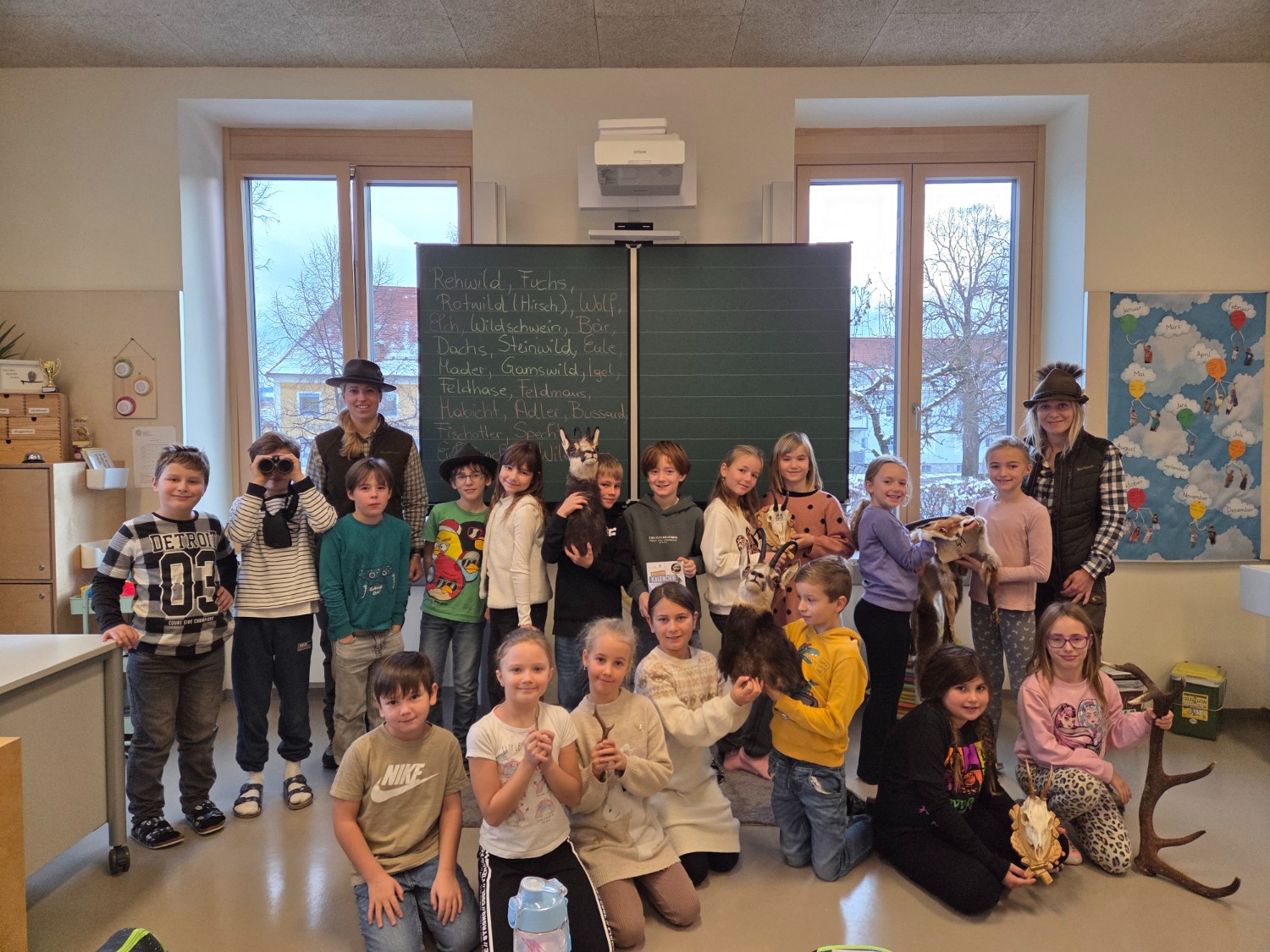 Zum Abschluss hatten die Kinder die Möglichkeit, eine Vielzahl an Anschauungsmaterial zu betrachten und zu berühren, darunter Fuchsfell, Hirschabwurfstangen, Rehkrickerl, Gamspräparate und sogar einen Fuchsschädel. Das Interesse der Kinder war groß, und die beiden Jägerinnen freuten sich besonders darüber, wie viel Wissen die Schülerinnen und Schüler bereits über die Jagd mitbrachten.