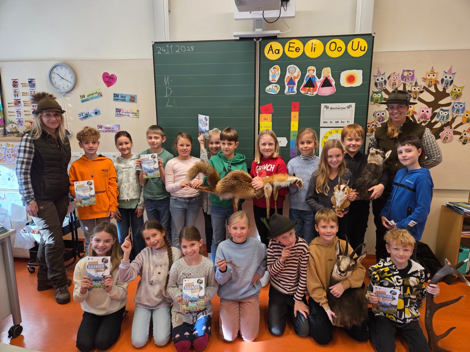 Ende November nutzten die beiden Jägerinnen Caroline Hausberger und Edith Wilding im Rahmen der alljährlichen Kalenderübergabe des Jagdschutzvereins die Gelegenheit, mit den Kindern der 3. Klassen der Volksschule Weißkirchen über die Jagd und die Natur zu sprechen.