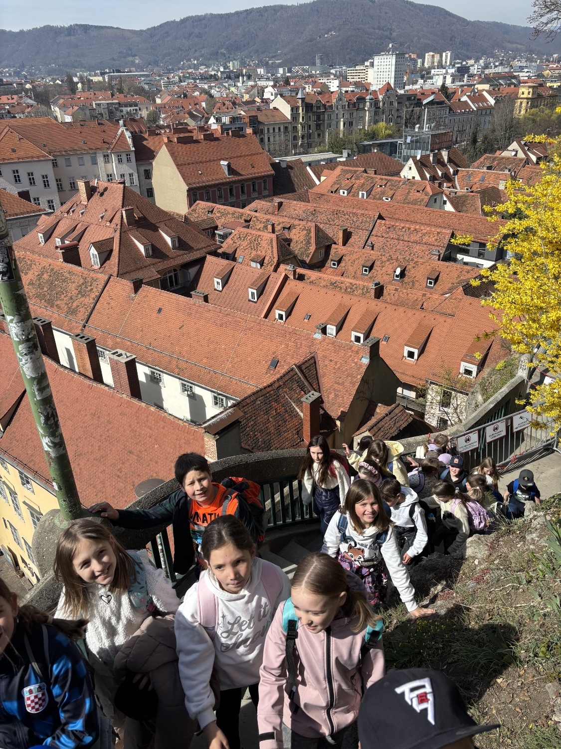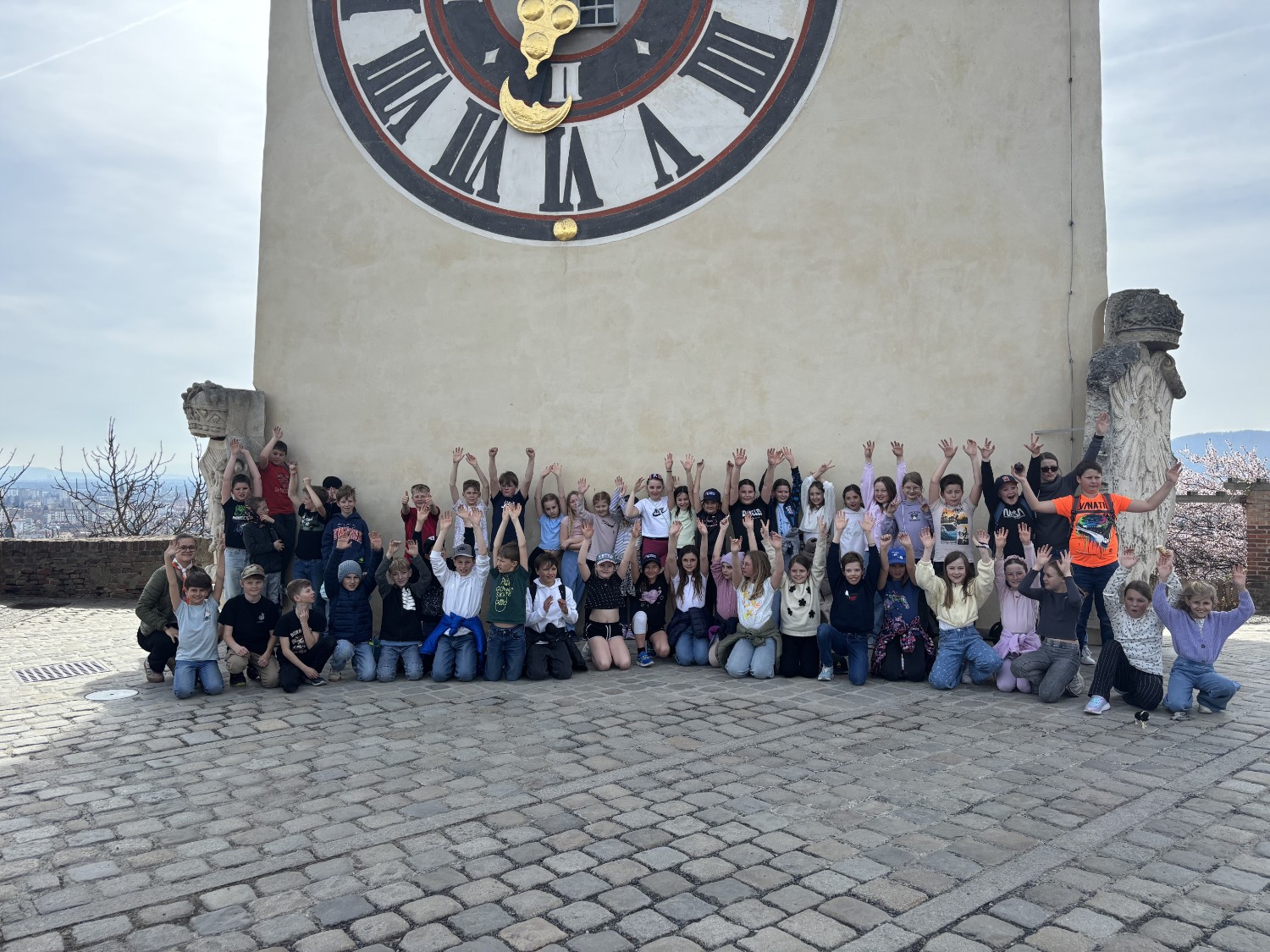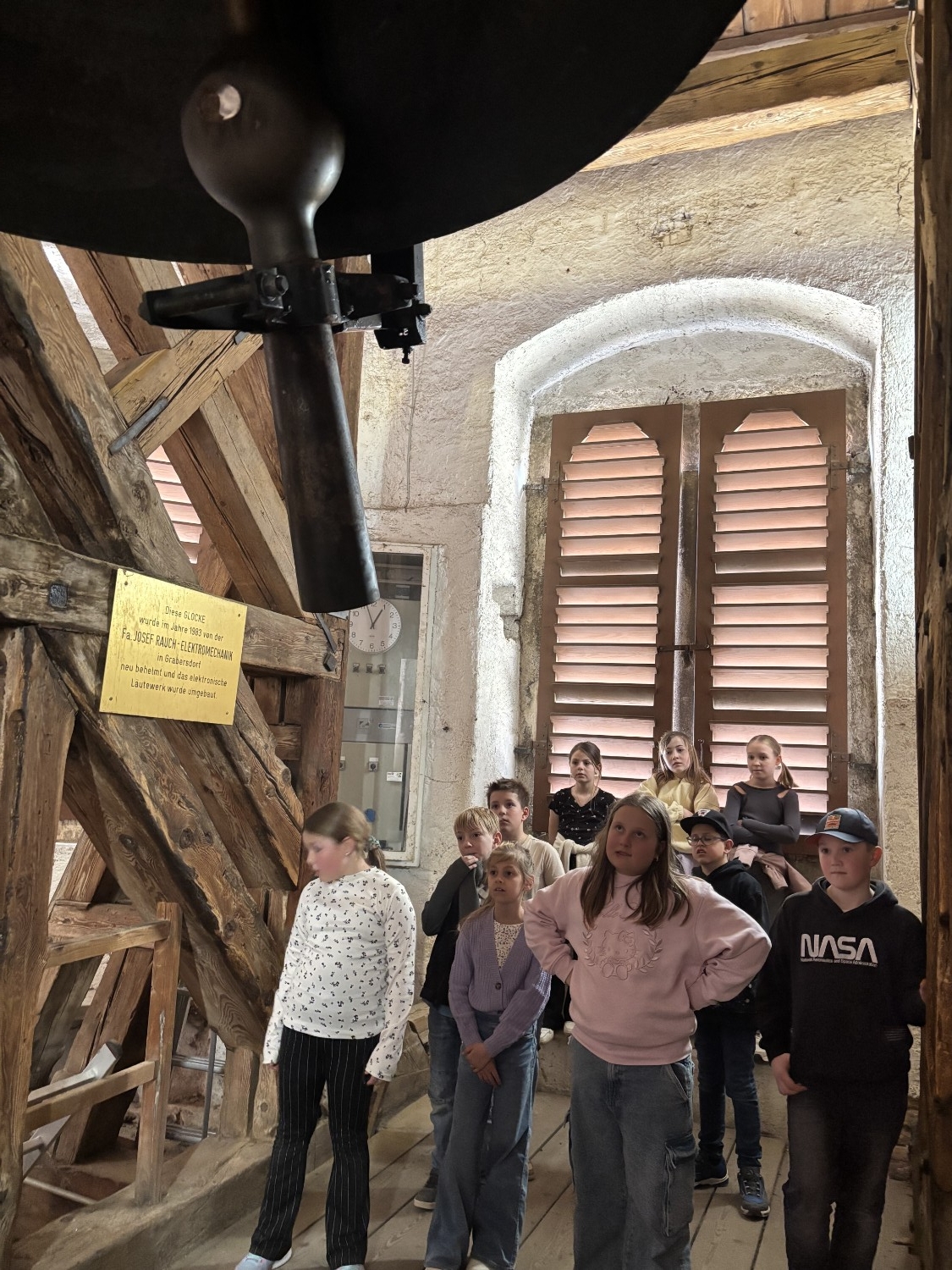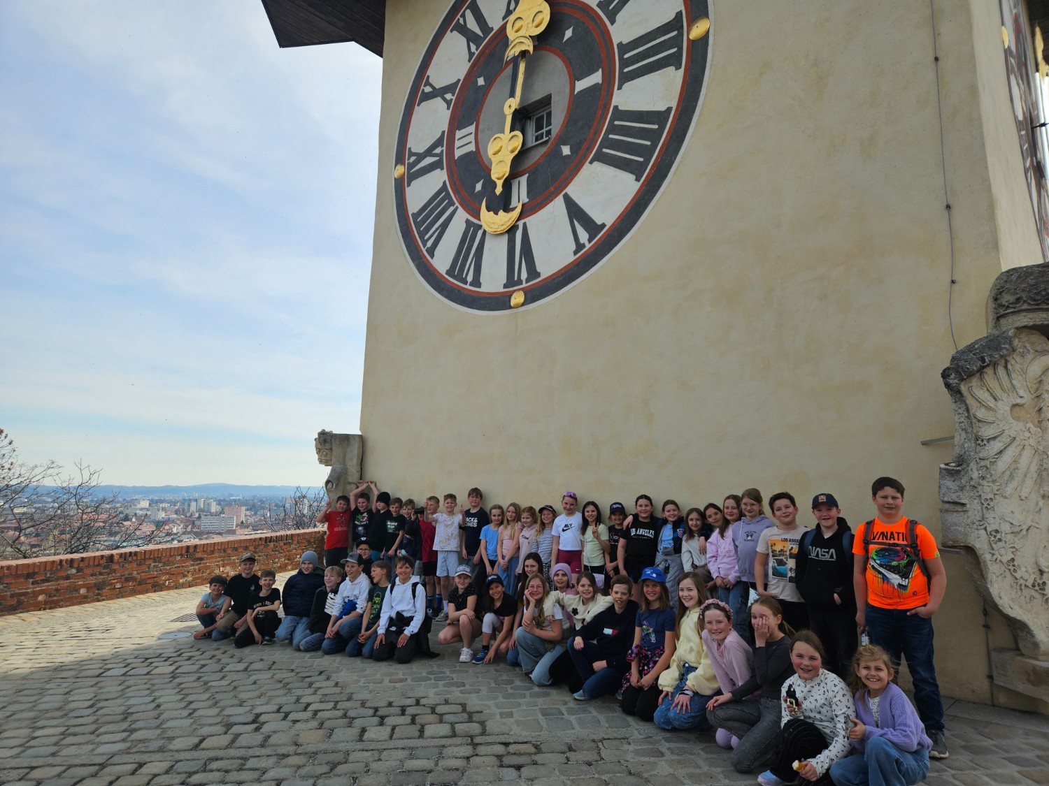 Anschließend ging es weiter auf den Schlossberg, eines der bekanntesten Wahrzeichen von Graz. Bei einer spannenden Führung erfuhren die Kinder viel Wissenswertes über die Geschichte der Stadt und die Bedeutung des Schlossbergs. Ein besonderes Erlebnis war der Besuch des Inneren des Glockenturms, der normalerweise nicht alltäglich zugänglich ist. Dieser Einblick machte die Führung zu etwas ganz Besonderem.
